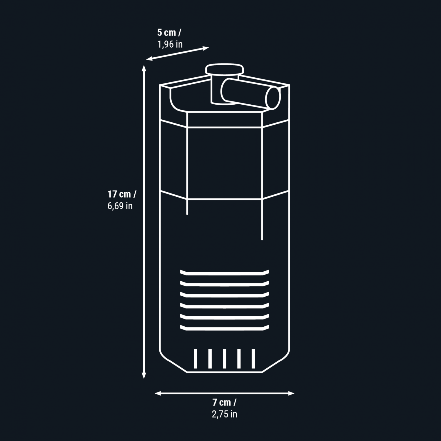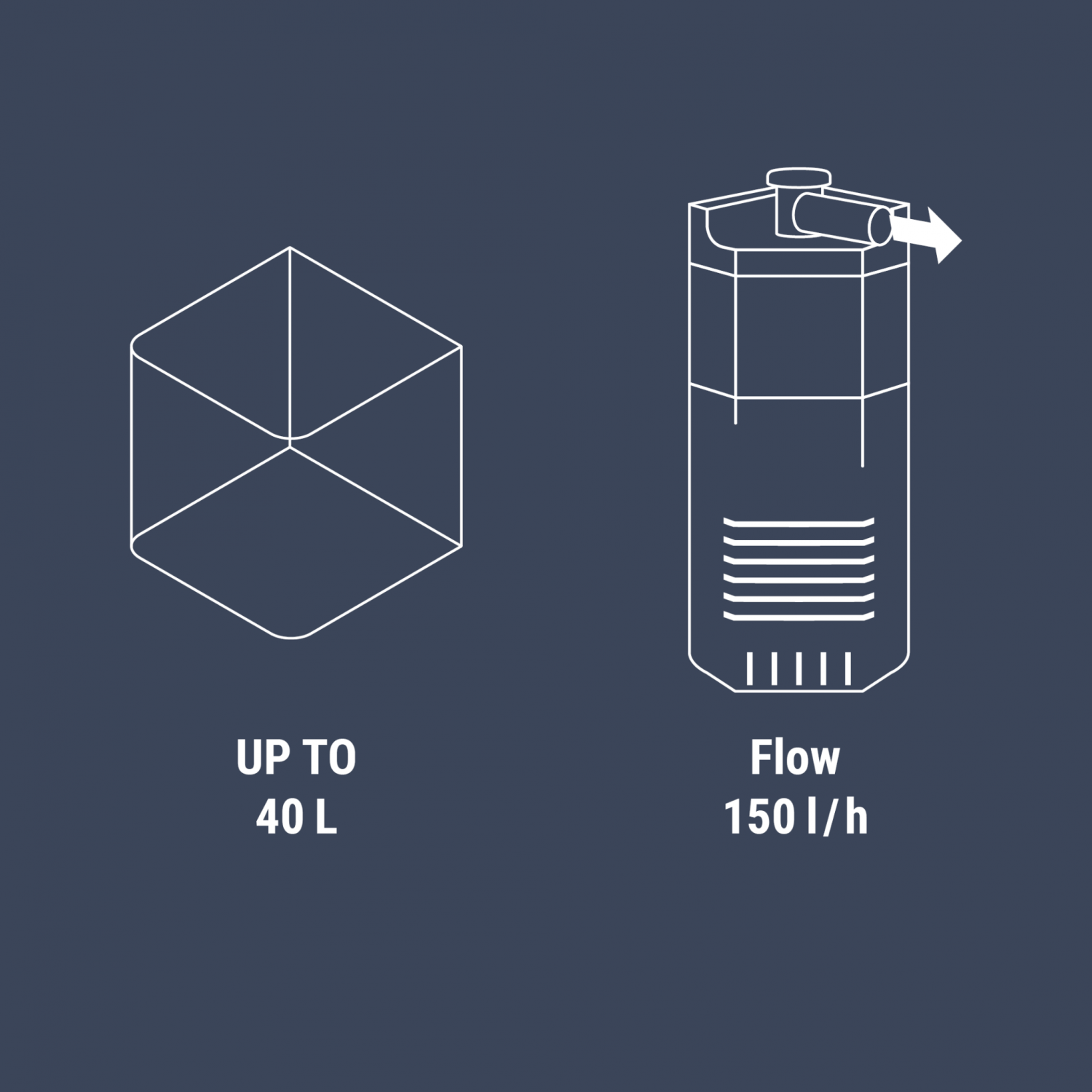 Het Nano Hoekfilter is krachtig met een pompcapaciteit van 150 l/u. De pomp draait zo stil en geruisloos dat deze praktisch niet te horen is. Ook het stroomverbruik is zeer laag: slechts 2 watt - dit spaart natuurlijke hulpbronnen. De waterstroom is traploos regelbaar, en de waterstroom kan worden gericht in elke gewenste richting door de 90 graden draaibare filteruitlaat. De filter heeft een spuitbuis met geïntegreerde reinigingsschuif en een mini-borstel voor eenvoudige reiniging van de spuitmondopeningen. Vanwege de smalle aanzuigopeningen en een zeer fijnmazige voorfilter spons is de Nano Hoekfilter ook veilig voor jonge garnalen. Het reinigen van het filterelement is eenvoudig: pak gewoon het filter bij de uitstroompijp en trek het naar voren, verwijder vervolgens het filterelement. Het is het beste om het filterelement in een schone emmer met aquariumwater te wassen om de belangrijke filterbacteriën niet te beschadigen.Specificaties